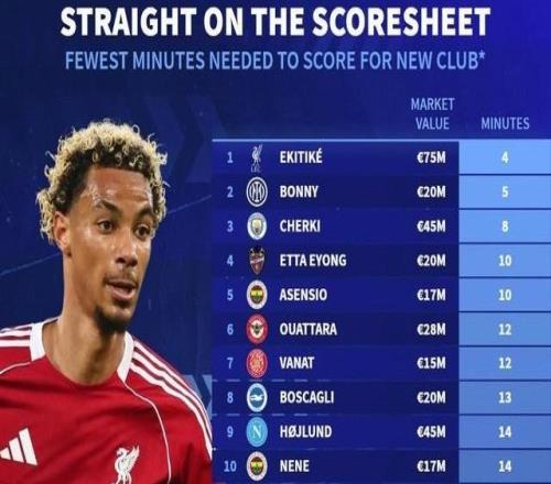 北京时间10月8日,德转统计了夏窗最快攻入新赛季首球球员,埃基蒂克以开场4分钟进球排名第一,博尼以一分钟之差排名第二,谢尔基排名第三。埃基蒂克夏窗以9500万欧元从法兰克福加盟